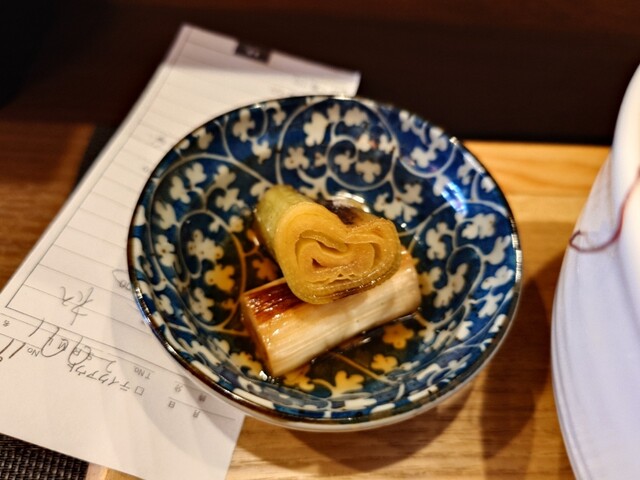 着席してから、選べる小鉢一品を尋ねられる。焼きネギのおひたしを注文する。