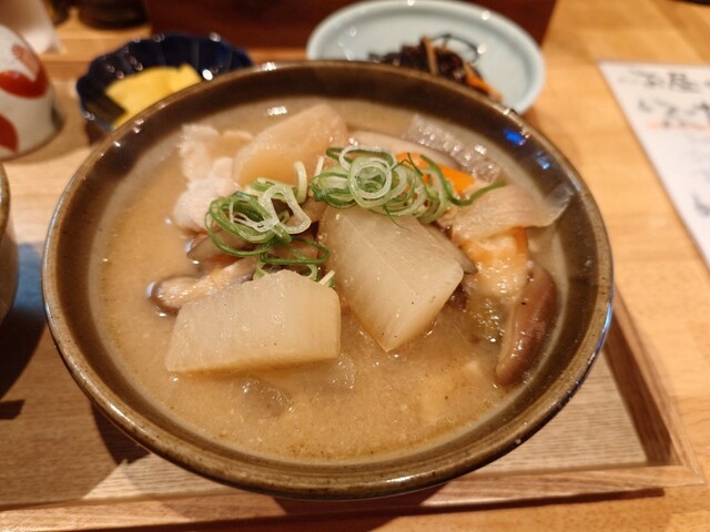 具だくさんのぶたじるには、大きな野菜がたっぷり入り、ぶたじるの底の方には木綿豆腐も2切れ入った。