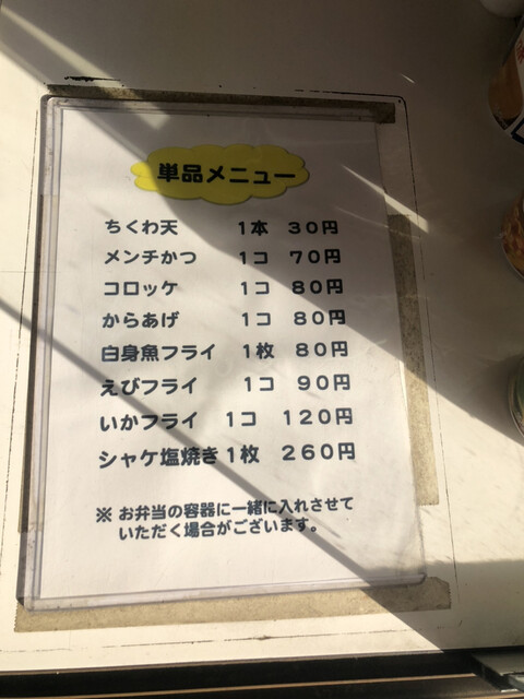 黄色い看板が目印で、幼き頃から通っているお弁当屋さん。イートインはありません。
