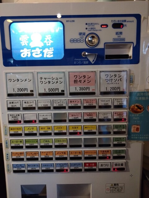 店内で4人待ち。食券(ワンタンメン¥1,200)を購入し店員さんへ渡し、店内の椅子(6人分)に座り待つこと約10分、2人席に案内される。