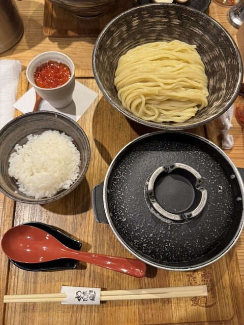 明太子たっぷりで醤油ベースのつゆを潜らせていただくつけ麺スタイル