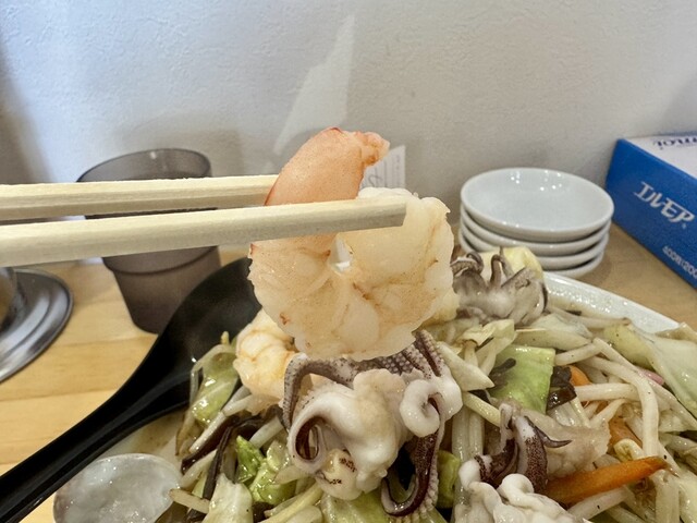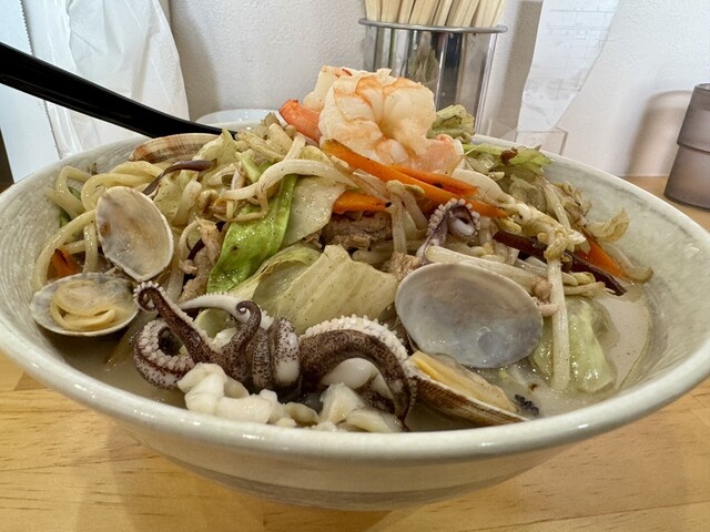 スープは豚骨に野菜、海鮮の出汁が加わって美味過ぎる!麺は細目よりの中華麺でスープを吸って柔らかくなって個人的には好みです
