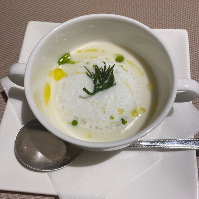 ポタージュにオリーブオイルがかかっており、フレッシュな味わい。しゃくしゃくとした葱の食感がアクセント。