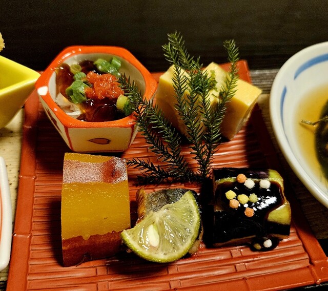 個室のテーブルで待つこと5分、まずは先付けのようなサラダや豆腐、お浸しが来ました