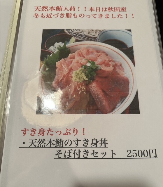お昼には奮発しすぎちゃったなぁと思いつつ5分ほどで運ばれてきて、食べた途端、こんなに上手い鮪と蕎麦は初めて!2500円じゃ安い!と思いました。
