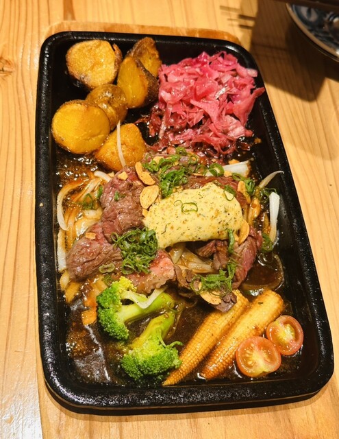 特選黒牛厚切りハラミのJu-Ju-鉄板ガーリックステーキ(お肉も柔らかく食べ応えあり、多めに添えられた野菜も美味しい)