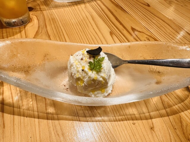 トリュフ塩ミルクアイス(あまり食べたことない味、大人味でほどよい塩味と濃厚ミルクが食事後にぴったり、デザートまでこだわりを感じた)