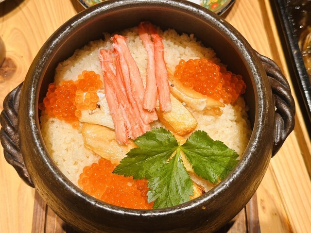 ズワイガニと鮭ハラスいくら土鍋ご飯(提供時間がかかるので最初に頼んだほうが良い)