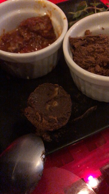 肉のワイン煮は肉臭さはありますが柔らかくて美味しい。肉チョコはトリュフの中にナッツとお肉が入ってます。少しお肉の匂いがします。あとはチョコのレバーペーストみたいなやつ。これはチョコでした(*^^*)