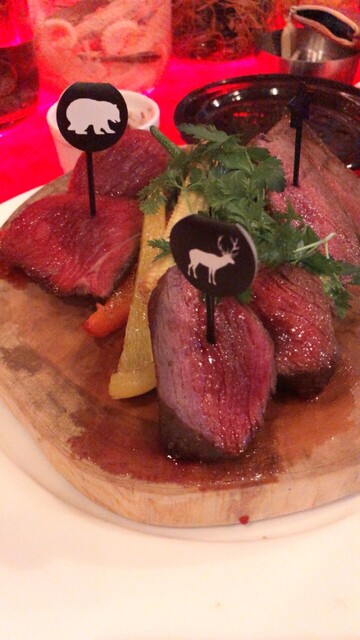 肉三種盛り、鹿、ヒグマ、トナカイ。星のヤツがトナカイです。鹿は臭くて癖があります。ヒグマは硬くてキッチンバサミを借りてカット。ザクザクという音が…