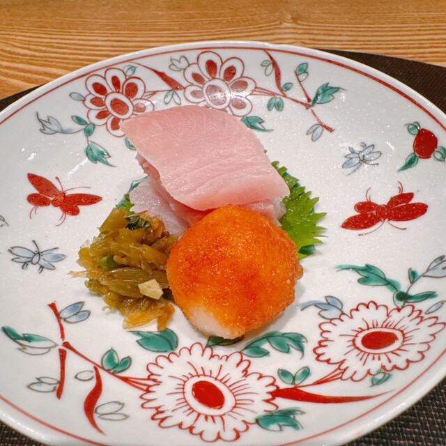 ☆八寸(金時草お浸し、蛸、バイ貝、衣被、粟麩照