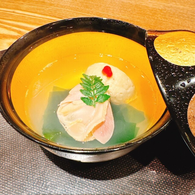 ★海老真丈のお椀、冬瓜、新蓮根、じゅんさい(秋田)、梅、柚の皮