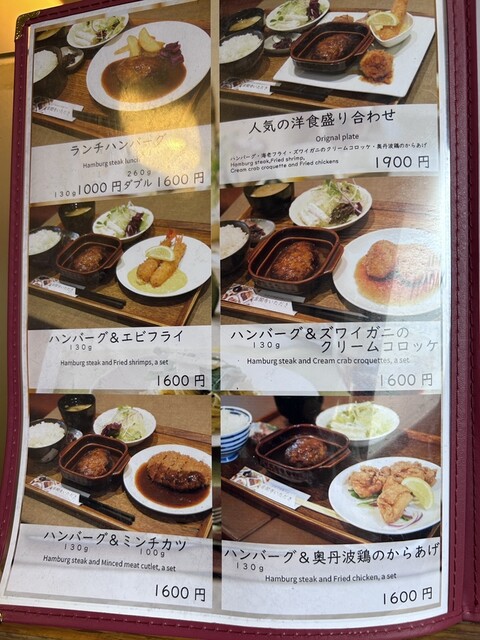 待ってる時間にメニューを熟読、ハンバーグを基本としたコンビセットが多く、大人の楽しみが膨らみます!