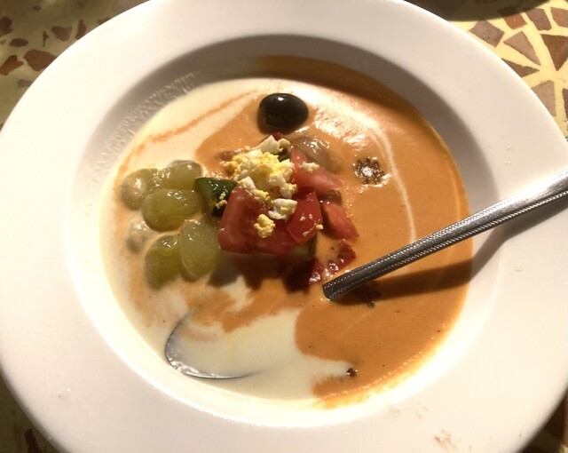 次のガスパチョは、トマトベースの冷たいスープに、ひよこ豆、胡瓜、玉子、ブドウ、オリーブ等が入っていて、塩味、酸味、甘味のバランスが良く、大変に美味でした。スープに浮かべられた甘いチュロスの輪切りも、楽しいアクセントになっていました。