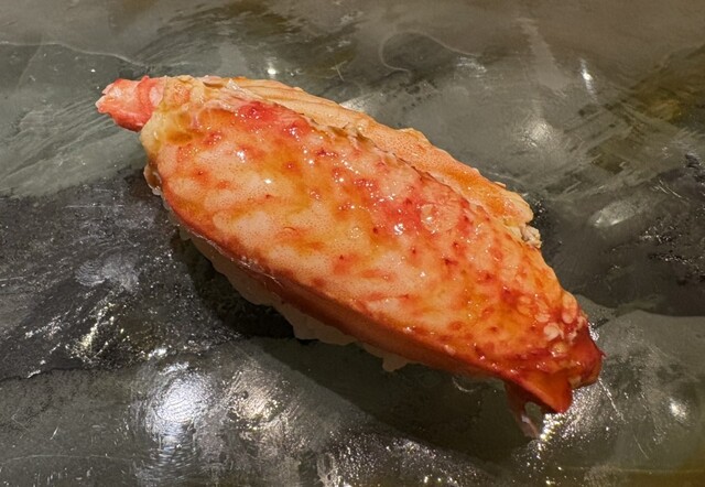 次に、昆布の上で十数分かけて醤油に漬けられた赤身、振り塩された中トロが出てきました。赤身は昆布の旨味と醤油がほどよく染みて、また中トロは脂が乗って柔らかく、味が濃厚で、塩梅もよく、どちらも大変美味しく頂きました。
