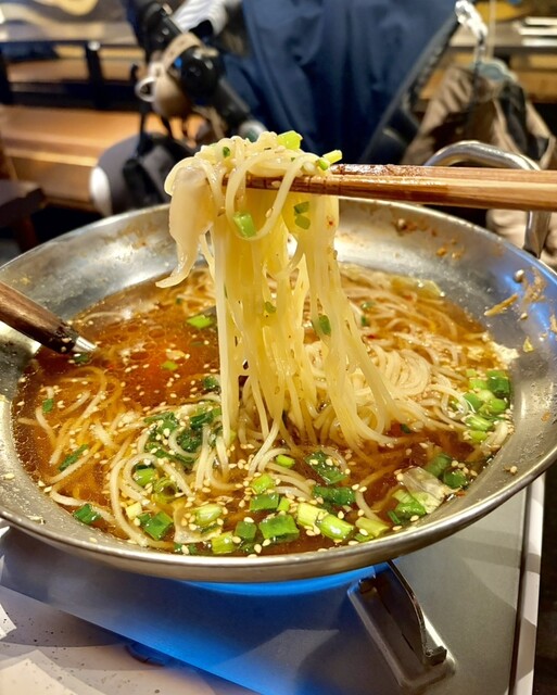 『博多醤油の牛もつ鍋』 香ばしい博多醤油の風味と、ぷりぷりの牛もつの旨みが際立つ濃厚な特製もつ鍋 甘じょっぱい醤油ベースのスープに、糸唐辛子のピリッとした辛味がアクセント くたっと煮込まれたキャベツにも旨みがしっかり染み込み、箸が止まらない美味しさ! 〆はラーメンを投入し、胡麻の香ばしさが加わって最後まで大満足でした