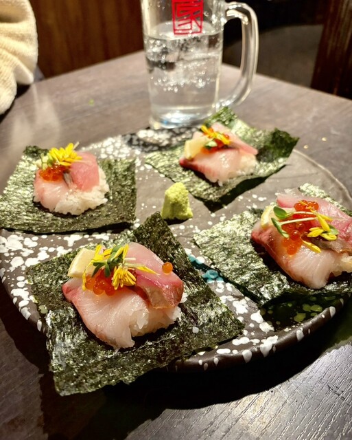 【《名物》】『旬魚の贅沢手巻き寿司』 一口ごとに広がる旬魚の旨みと香りを楽しめる、贅沢な名物手巻き寿司。 この日は、わらさ・ぶり・いくらをたっぷり包み、仕上げに添えられたレモンが爽やかに香ります いくらの程よい塩気と、ぶり・わらさの濃厚な旨みが重なり、最後にレモンの酸味が後味をきれいに締めてくれる上品な味わいでした。