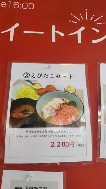 私はせっかくなので一番人気の「えびセット」2400円を注文。注文は入口を入ったカウンターで行ないます。テイクアウトも出来るみたいです。えびセットはえび丼(L)にえび汁、熟成真たらフライ、ツブ唐揚げとデザート(チビソフトクリーム)のセットとなります。えび丼(L)単品が2100円なので、Lを食べるならセットの方が断然お得です。