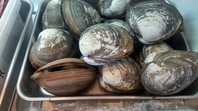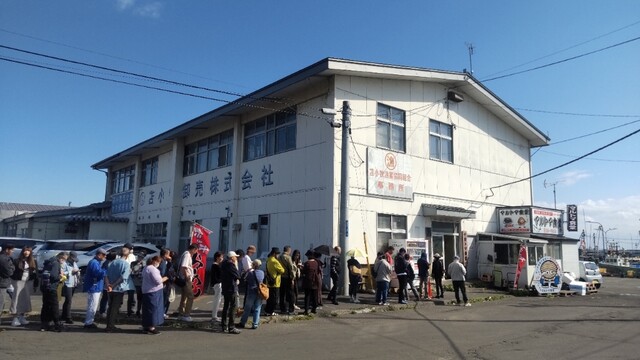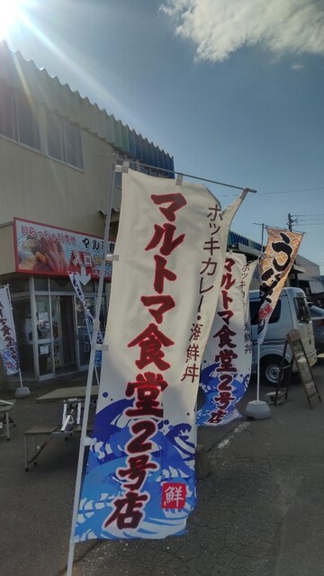 苫小牧港の「ぷらっとみなと市場」から漁港方面に200㍍付近に「マルトマ食堂」があり「ホッキカレー」を食べようと向かいましたが、平日火曜日の13時過ぎと言うのに待ち時間は1時間30分との事、、流石に厳しいので食べログで見ていた「マルミ商店」へ行きました。こちらのお店はマルトマ食堂の二号店で買物とテイクアウト専門のお店。ただ2階で購入した物を食べれる場所も用意されて、ホッキカレー等はマルトマ食堂と同じ味と量、更に待ち時間は殆ど無く注文から提供まで10分弱でした。お店は市場からマルトマ食堂に行く途中にありますので市場の駐車場に車を停めれば大丈夫です。