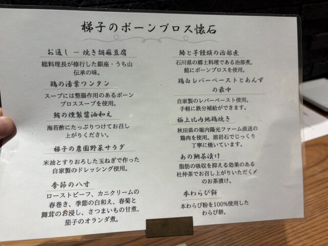 お出汁は鶏の⾻から取ったボーンブロス。整腸作⽤あり。