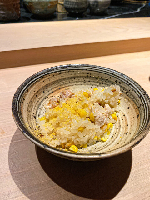 〆の土鍋ご飯には仕上げにカラスミが。風味がよくとうもろこしの甘味がたまらない。