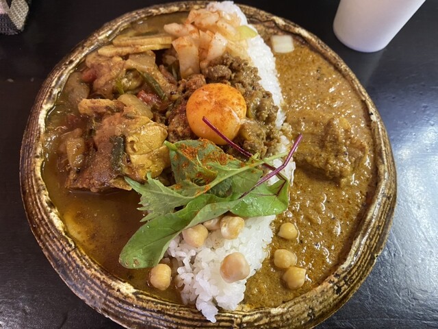 三連休の最終日、良きお天気に誘われてぶらりと代々木公園を目指す。と、言うよりこのお店目当てでした。11時頃到着してお店を覗くと満席ですが、待ち人はいなく待つ事5分で入店。一番人気のメニューでオーダー。前金制なので、直ぐに支払い。お品も直ぐに運ばれてきました。見た目から美味そうだ。先ずは黄身を崩して目で楽しみ、キーマを食べる。そしてポークを食べて、チキンカレー。自分的にはチキンカレーが一番好みだけど、キーマも美味しい。ボリュームもあって美味しく頂きました♪完食です。ご馳走さまでした♪。