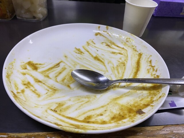 遂に来ました、このお店!三度目にして、やっと入れました。今日はAM11:30前にお店に着くと5名くらいしか列にはいない。コレは並ぶしかない。いつも諦めていたので、胸が高鳴ります。オーダーするものは、既に決まっています。大体、20分くらいで店内に入れました。早速オーダーして待つ事5分,頼んだお品が着膳。牛すじカレー(並)にトッピングで追い牛すじとコールスローです。うまっそー。当然、ベジタブルファーストからのカレーを一口。うーん、牛すじがとても柔らかくて美味しい。もう、この店の雰囲気からこの味を誰が想像できるでしょう。味の虜になりました。完食です。ご馳走さまでした♪また、来ます。