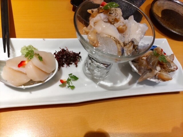 注文したのは帆立、つぶ、ホッキのお造りの盛り合わせ じゃがバターの塩辛添え 八角の焼き魚等北海道らしいものばかり。