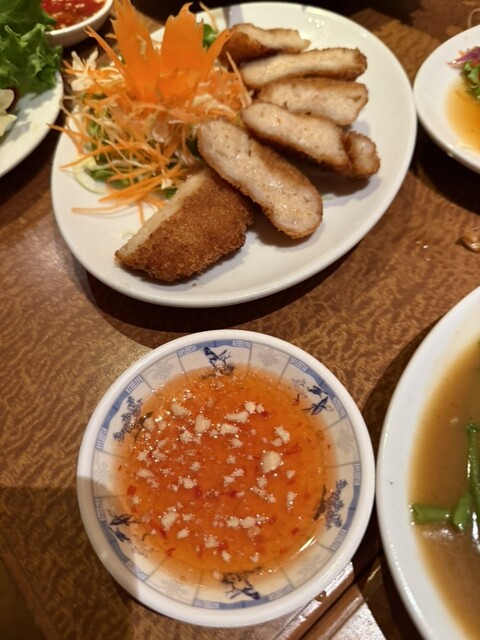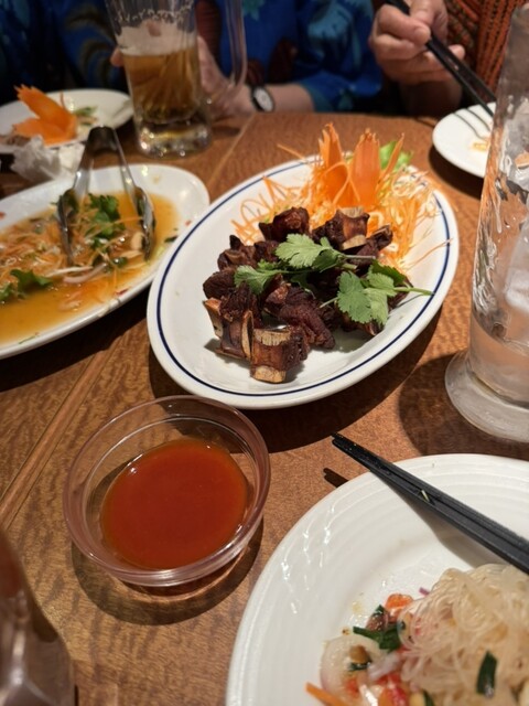 まずは生春巻き。そして名前を忘れてしまったけど、豚のハム?にキャベツと生姜の千切り。。これがめちゃ美味しいのだ。そして大好きな軟骨揚げ。ベトナム風オムレツ、空芯菜炒め、海老さつま揚げ、鶏肉のグリーンカレーにマッサマンカレー、そしてデザートのココナツアイスクリームにマンゴーともち米。。。タピオカ。。名前を忘れたけど5種類のデザートの全てが美味しかった〜