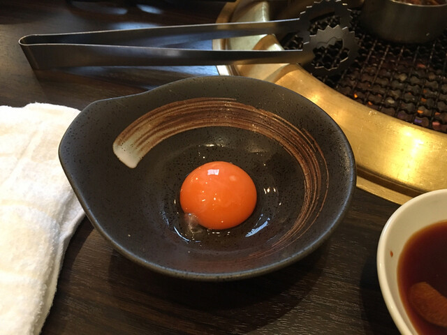 そして一口サイズのご飯の上にお肉をのせてタレをかけて、とどめに卵黄を乗せていただきます。