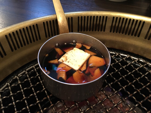 店員さんがすき焼きダレを網の上で温めて、その間に薄切りのお肉を焼きました。