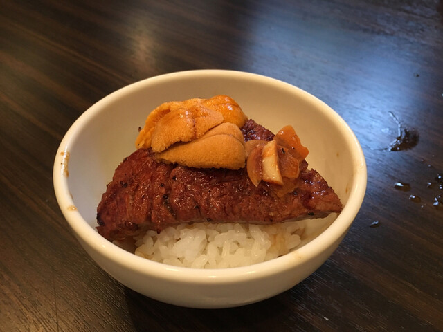 ご飯の上にシャトーブリアン、その上にウニをのせて