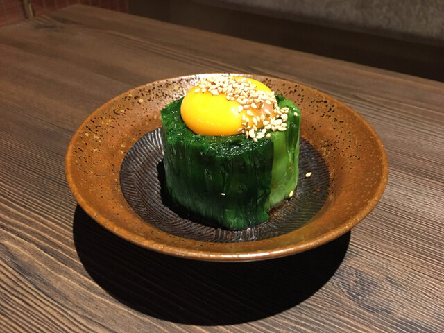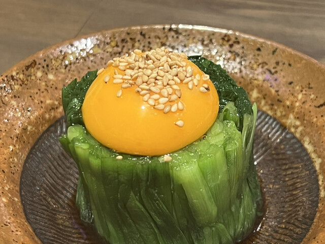 ニラのおひたしに卵黄が載っています。