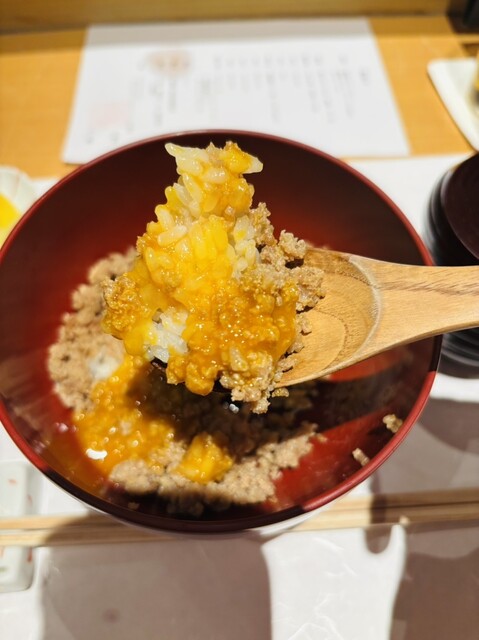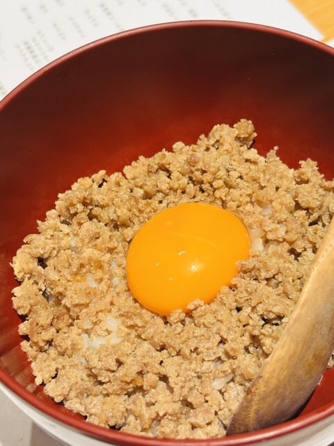 ・つくね…とろっと卵黄かけて食べる。ふわふわ柔らかくて、とても細かく刻まれた軟骨の食感が良いです。タレと卵黄が濃厚ですが大葉のおかげでさっぱりと頂けます(^^)