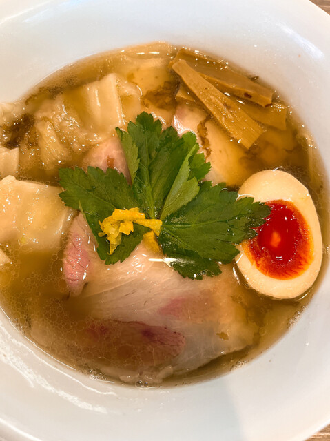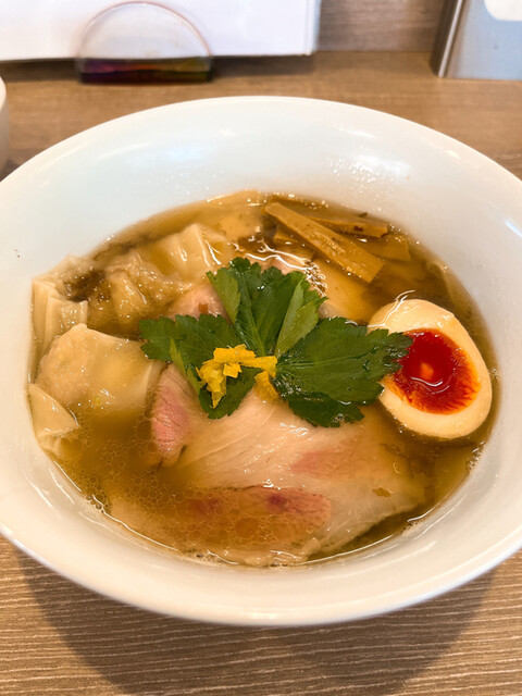 トッピングに煮卵、豚チャーシュー二種低音と焼き、メンマ、ワンタン二つ