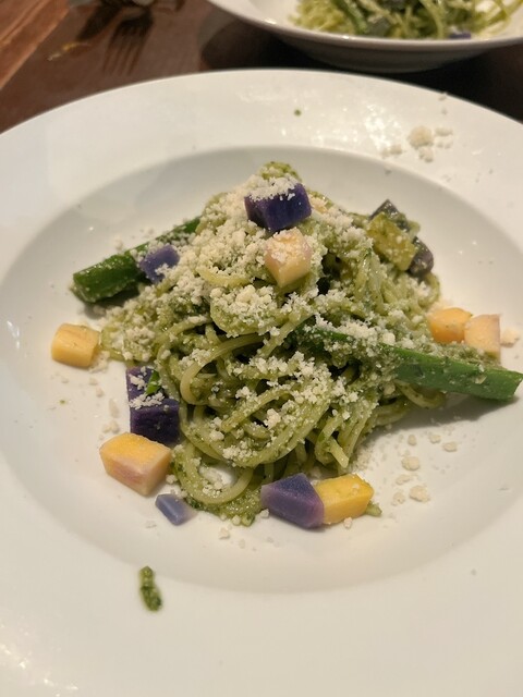 ジェノベーゼはもっちりとしたパスタによく絡み、冷菜がシャキシャキとアクセントとなり楽しい!
