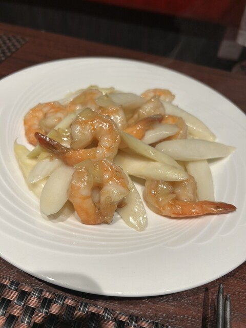 3品目は、海老とフレッシュホワイトアスパラの塩味炒め。