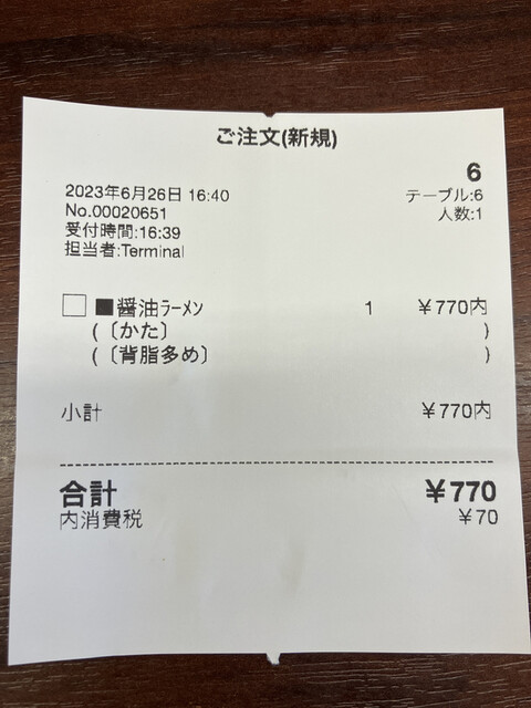 背脂醤油ラーメン(税込825円)