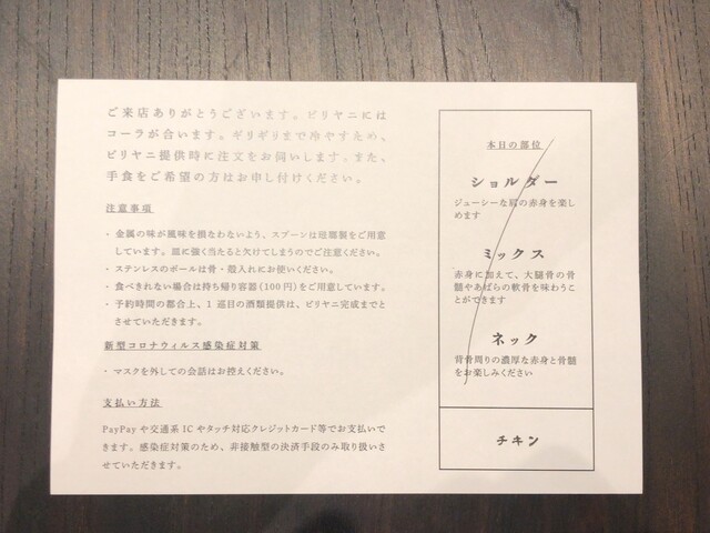 オーダー 税込価格 完全予約制 ビリヤニ一択 予約時サイズ選択 2オペ