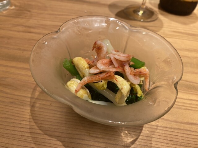 →大量の桜海老を刻み胡麻酢でソースに。大きなアスパラが添え物?ってくらいに桜海老の胡麻酢がメイン級の美味しさ。