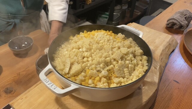 →黄色と白の2色のとうもろこしご飯には、油の乗ったアライグマのお肉を乗せて『ラスカル丼』名前付けると食べにくくなってしまいましたが笑
