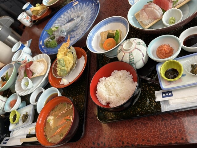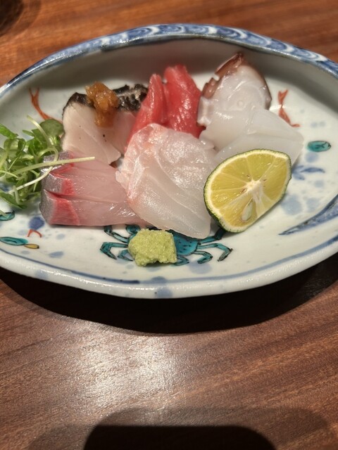 お造りの松山の鯛、カンパチ、縞鯵、ヤリイカは