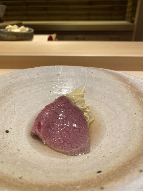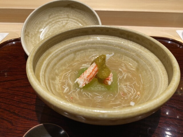 先付の茄子にボタン海老 雲丹を重ねたジュレ