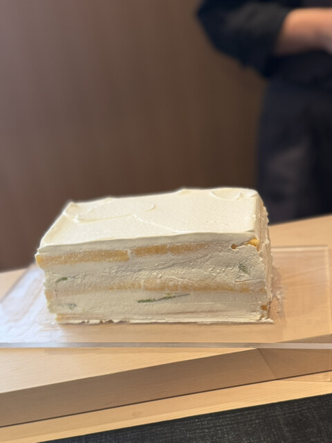 そして、次のマンゴーのミルフィーユが絶品すぎる。完熟マンゴーを一口大にカットされて、焼きたてのミルフィーユ生地と一緒に。