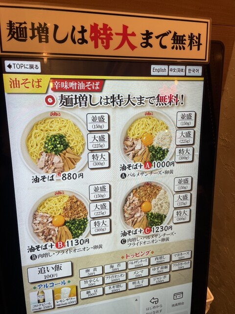 油そば880円(特大300g)の食券を購入して席に着席、空いている席2つから選ばせてくれたので、