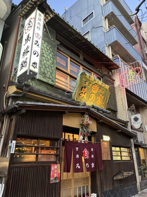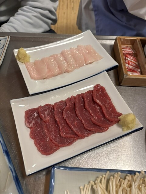 4名未満は予約出来ないので、17時前に行くと2番目、30分ぐらい待って入店し、桜なべのモモ肉、ロース肉、ヒレ肉の3種と肉さし、あぶらさし、玉子焼を3人で注文。各桜なべの肉には葱、白滝、お麩がついている...