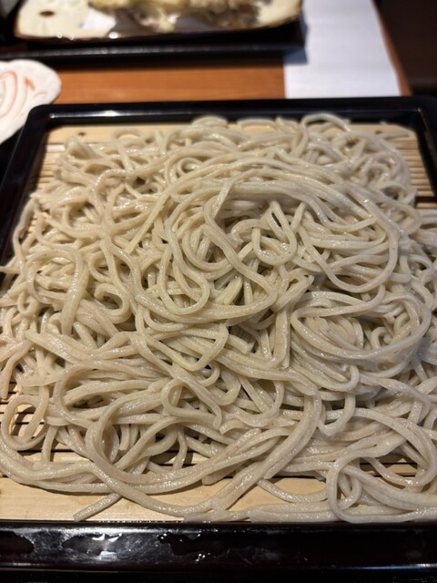 血液癌の経過観察のための受診が早く終わりランチをいただきました(オーダーストップ14時30分)。店内はほぼ満席で9割以上が女性客でほとんどの方がランチメニューからせいろと丼のセットメニューを食べておられました。今回はランチ天せいろをオーダー。通常の天せいろは大きな海老天が2匹ですが、ランチ天せいろでは小海老天が3匹に鶏天、鯵天?、半熟玉子天、エノキ天、人参天、獅子唐天と盛りだくさんで揚げ具合が絶妙で特に小海老天(予想以上に大きくぷりっ)は半生で甘み旨みが美味しい。お蕎麦は二八蕎麦で茹で具合と締め具合よく喉越し良し。蕎麦つゆは甘めで好みでした。1232円で最高のコスパでした。ご馳走様でした。