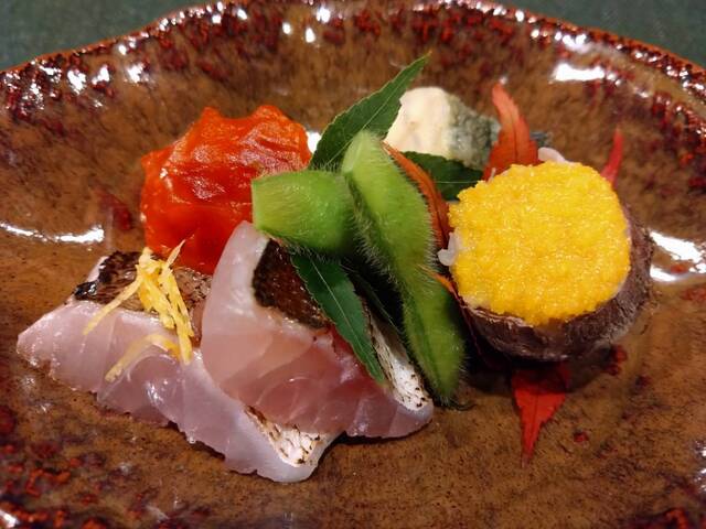 *卵黄の味噌漬け 銀杏 合鴨ロース 柿なます カマスの炙り