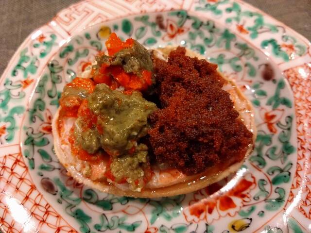 *空豆と塩雲丹 蛤の煮凝り 縞海老の昆布締め