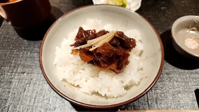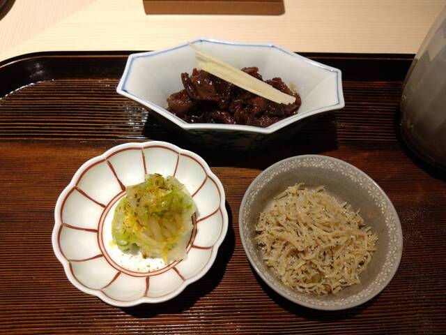 *縮緬雑魚 牛肉の時雨煮 赤出汁 香の物